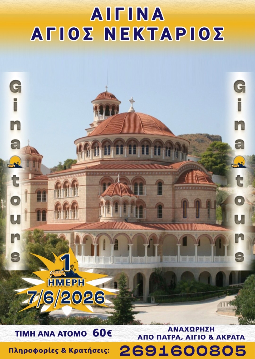 Αναχώρηση 05:00 πμ από το Αίγιο με προορισμό το λιμάνι του Πειραιά. Επιβίβαση στο πλοίο ώρα 08:20 πμ αναχώρηση για την όμορφη Αίγινα. Ύστερα από μιάμιση ώρα θαλάσσιας διαδρομής, άφιξη στο λιμάνι, επιβίβαση στο λεωφορείο και αναχώρηση με πρώτο μας σταθμό το ναός Αγίου Νεκταρίου στην Αίγινα αποτελεί ένα από τα κορυφαία αξιοθέατα του νησιού, στο οποίο συρρέει πλήθος κόσμου καθ’ όλη τη διάρκεια του χρόνου, τόσο για να προσκυνήσει τον τάφο του Αγίου Νεκταρίου όσο και για να θεραπευτεί.