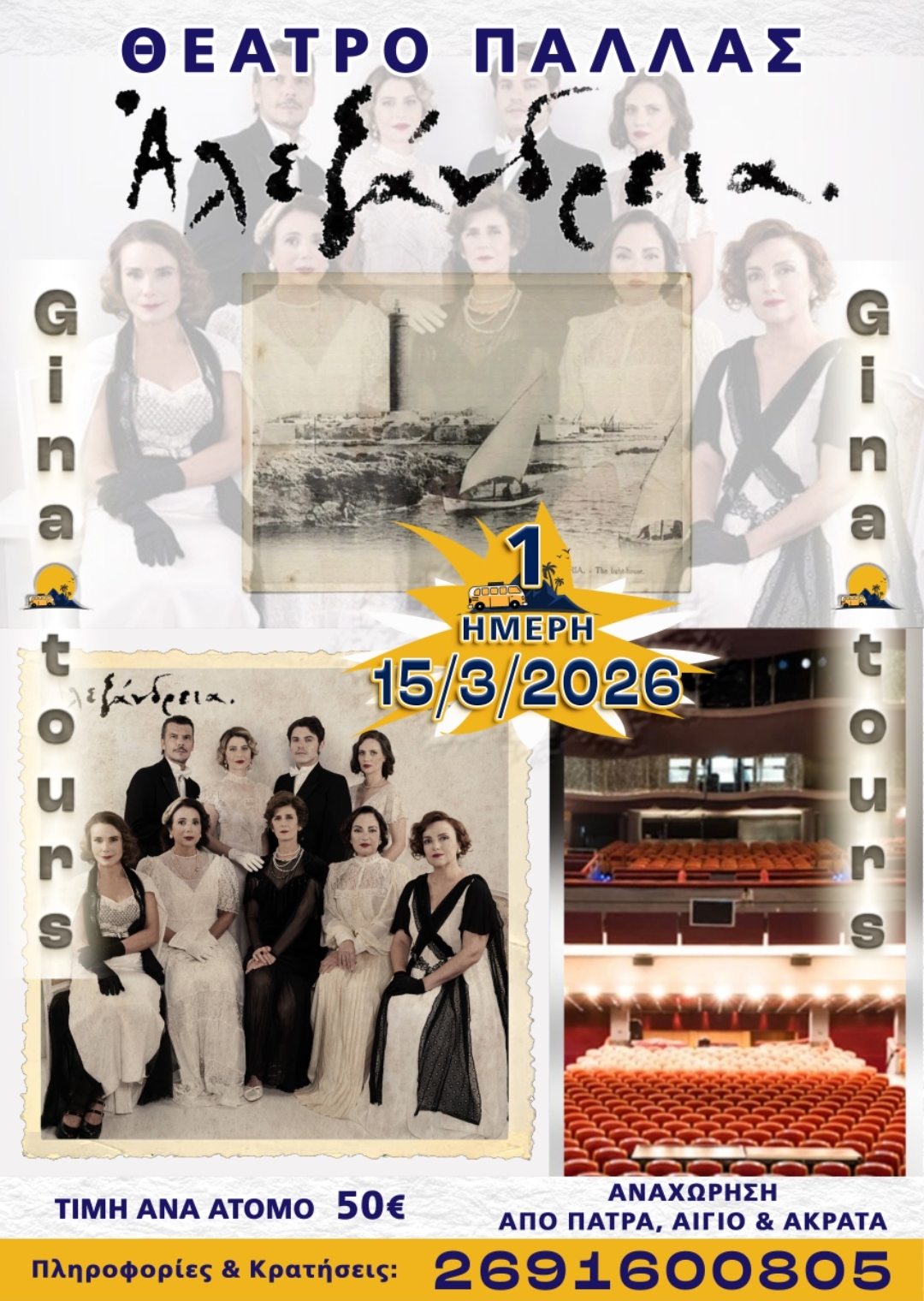 Αναχώρηση από Πάτρα Αίγιο και Ακράτα. Κάνοντας μία σύντομη στάση για καφέ και ξεκούραση θα επισκεφθούμε το θέατρο Παλλάς για να παρακολουθήσουμε την παράσταση της χρονιάς ΑΛΕΞΆΝΔΡΕΙΑ.