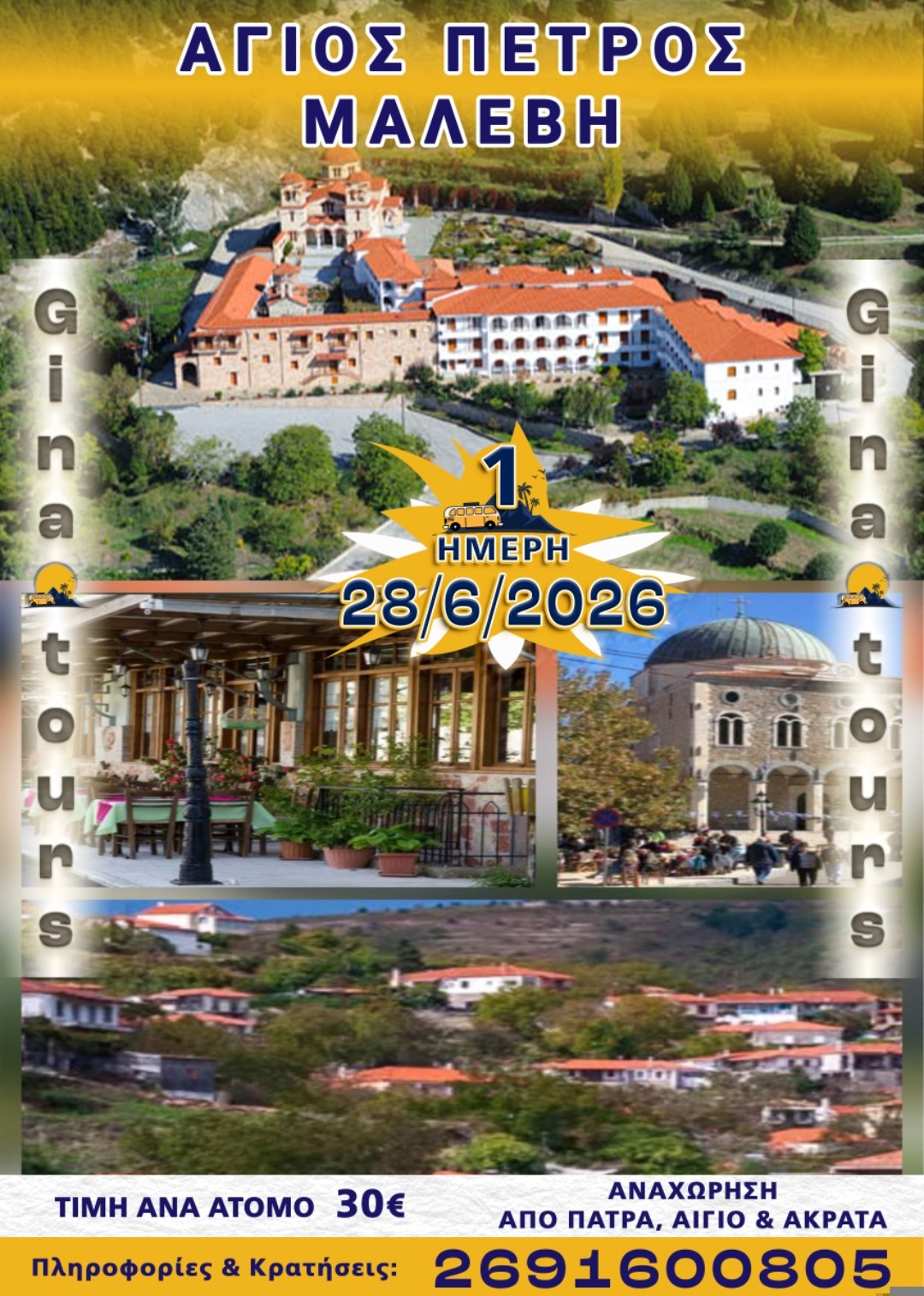 Αναχώρηση από το Αίγιο ώρα 06:00 πμ και από την Ακράτα 06:30 πμ για την Ιερά Μονή Παναγίας Μαλεβής , κάνοντας την απαραίτητη στάση στην Τρίπολη (στάση για καφέ στα ΣΕΑ Σπαθοβουνίου) συνεχίζουμε για Άγιο Πέτρο, Παναγία Μαλεβή . Εκεί θα έχουμε αρκετό χρόνο για προσκύνημα.