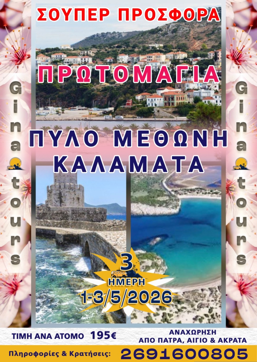 Αναχώρηση από Αίγιο 07:30πμ και την Πάτρα 08:00 πμ για την ευλογημένη Μεσσηνία.