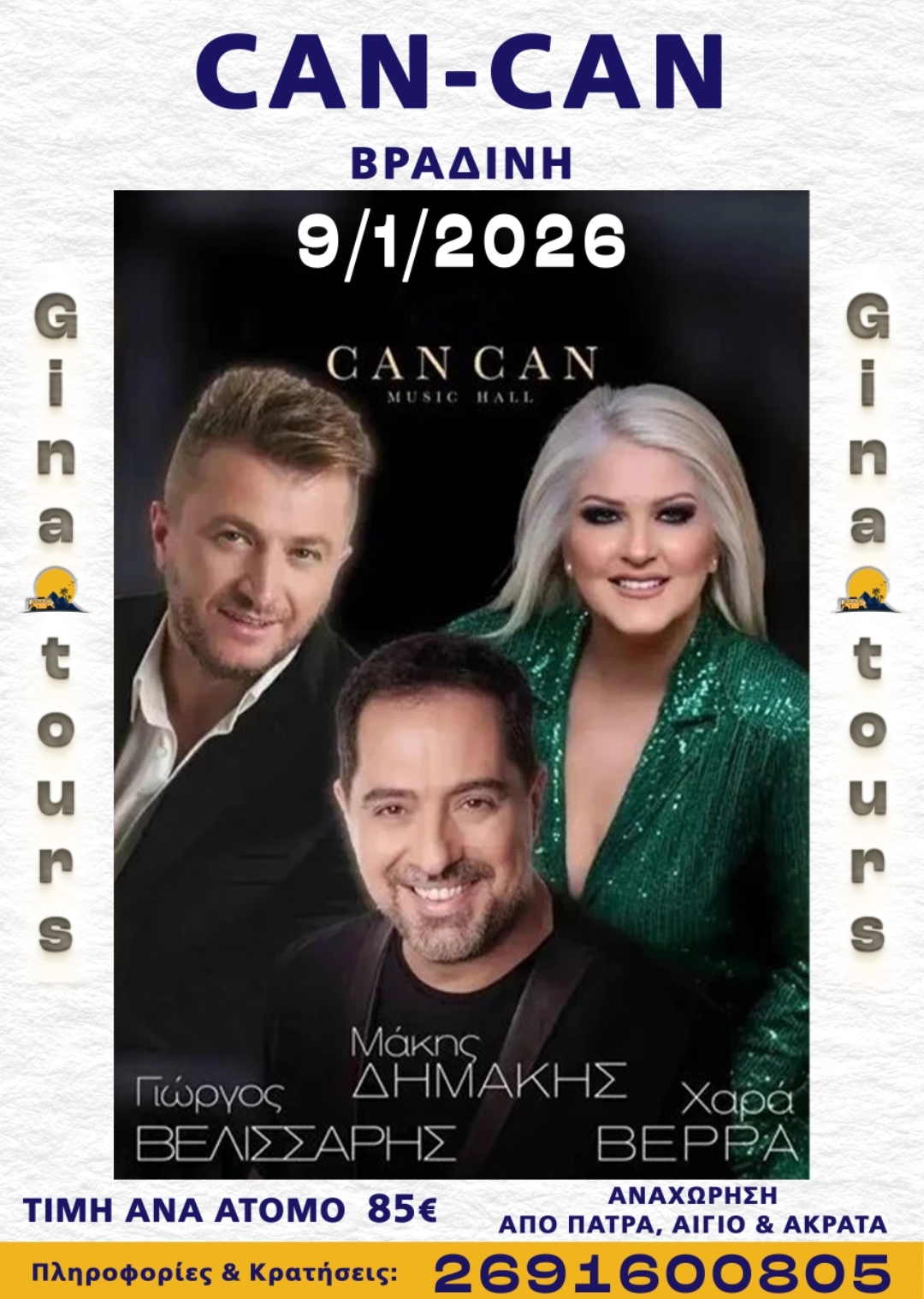Αναχώρηση από Πάτρα 20:30 , από το Αίγιο 21:00 και από την Ακράτα 21:30 και κάνοντας μία σύντομη στάση θα μεταβούμε στο κέντρο διασκέδασης CAN CAN Στο Can Can ο Μάκης Δημάκης , ο Γιώργος Βελισσάρης και η Χαρά Βέρρα σε ενα απόλυτο σχήμα που ανακτά λάμψη στη νυχτερινή διασκέδαση της Αθήνας. Στο νυχτερινό κέντρο Can Can Μπουζούκια για ακόμη μια χρονιά τα λαικά σχήματα έχουν την τιμητική τους.