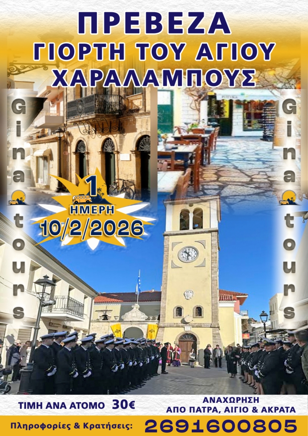 Αναχώρηση από την Ακράτα στις 07:00 και από το Αίγιο στις 07:30 και κάνοντας μία σύντομη στάση για καφέ και ξεκούραση θα μεταβούμε στην πόλη της Πρέβεζας όπου και θα επισκεφθούμε τον μητροπολιτικό ιερό ναό του Αγίου Χαραλάμπους στο κέντρο της παλιάς πόλης. Ελεύθερο χρόνο για προσκύνημα καθώς και βόλτα στη πόλη και φαγητό.